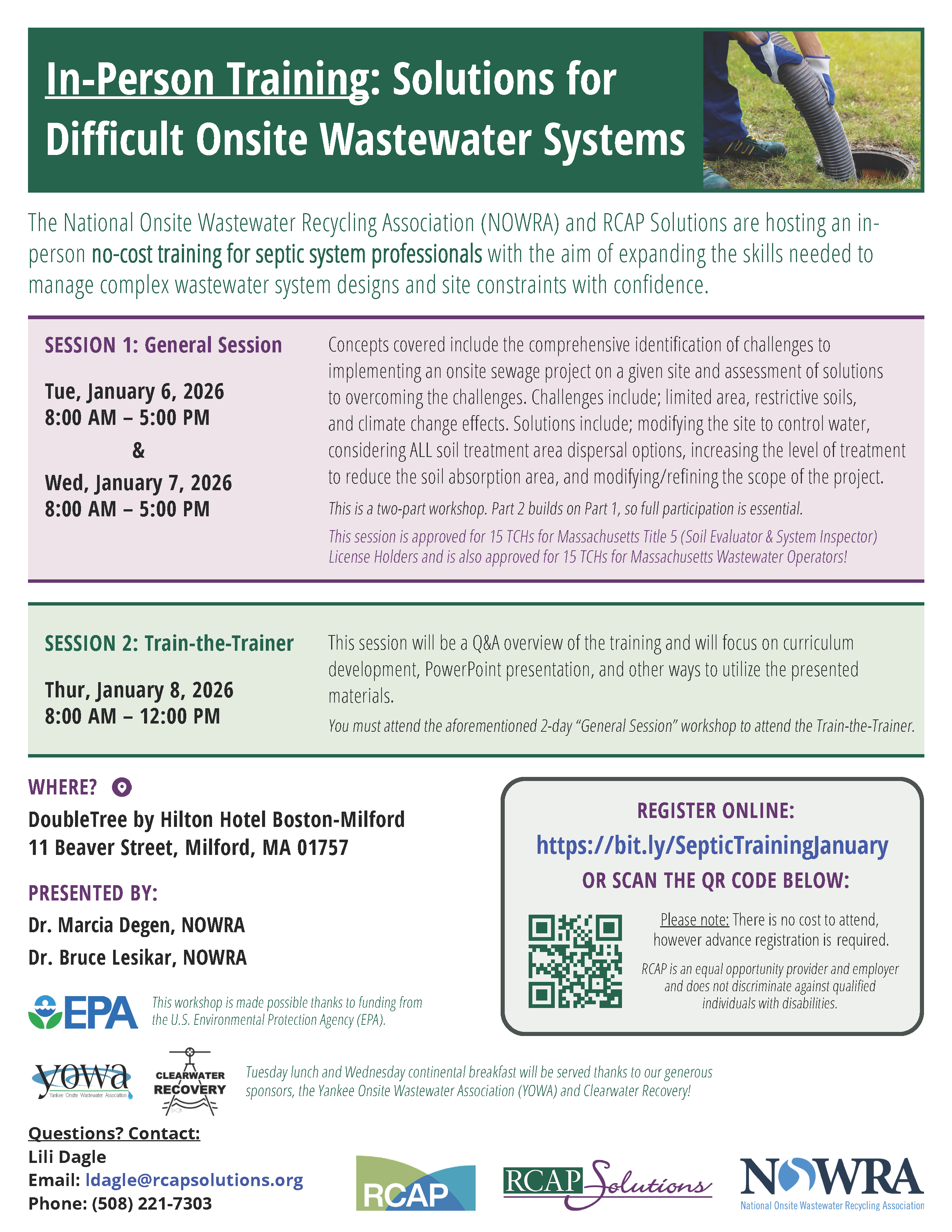NOWRA and RCAP Solutions invite septic system professionals to a free in-person training focused on enhancing skills for managing complex wastewater designs and site constraints with confidence.