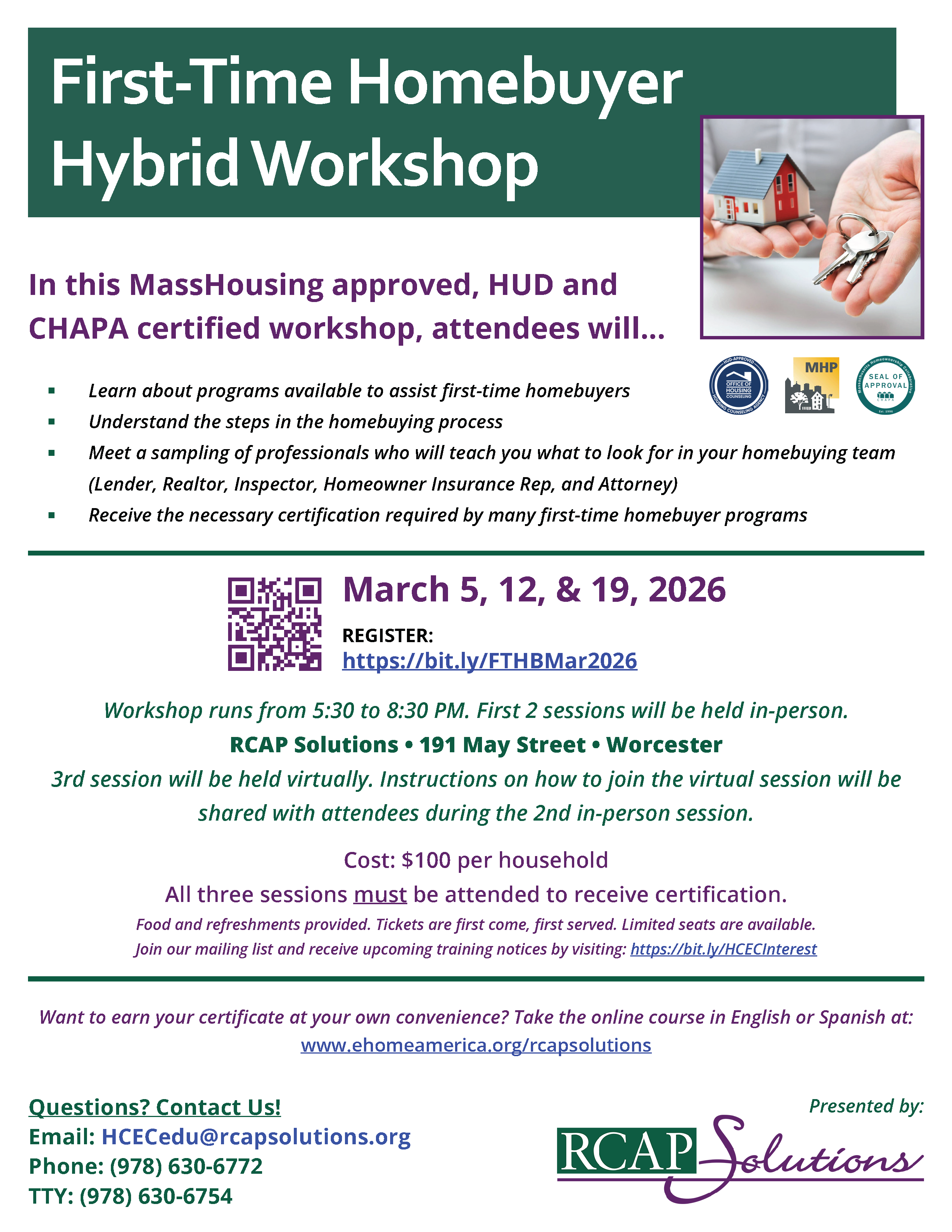 Please note, this is a three-day hybrid workshop running from 5:30 to 8:30 PM on March 5, 12, & 19. Attendance at all three sessions is required per HUD guidelines.